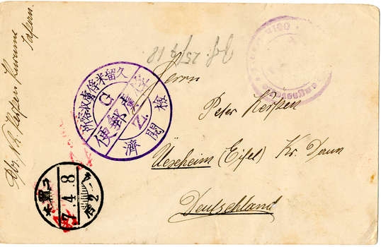 ab 21.11.1914 gefangen im Lager Osaka, 16.12.1914 verlegt ins Lager Tokushima (Gef.-Nr. 4217, Heimatort: Wermelskirchen), 06.04.1917 verlegt ins Lager Bando (Heimatanschrift: Wermelskirchen, bei Aug. Küpper);