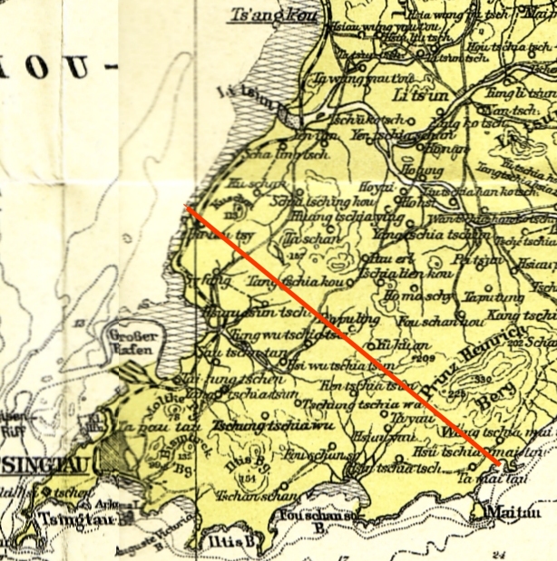 b) nach der Seeseite eine Linie von Iltishuk - Kap Jaeschke - Ostspitze Insel Huang tan - Südspitze Insel Yintau - Mündung des Haipo.«