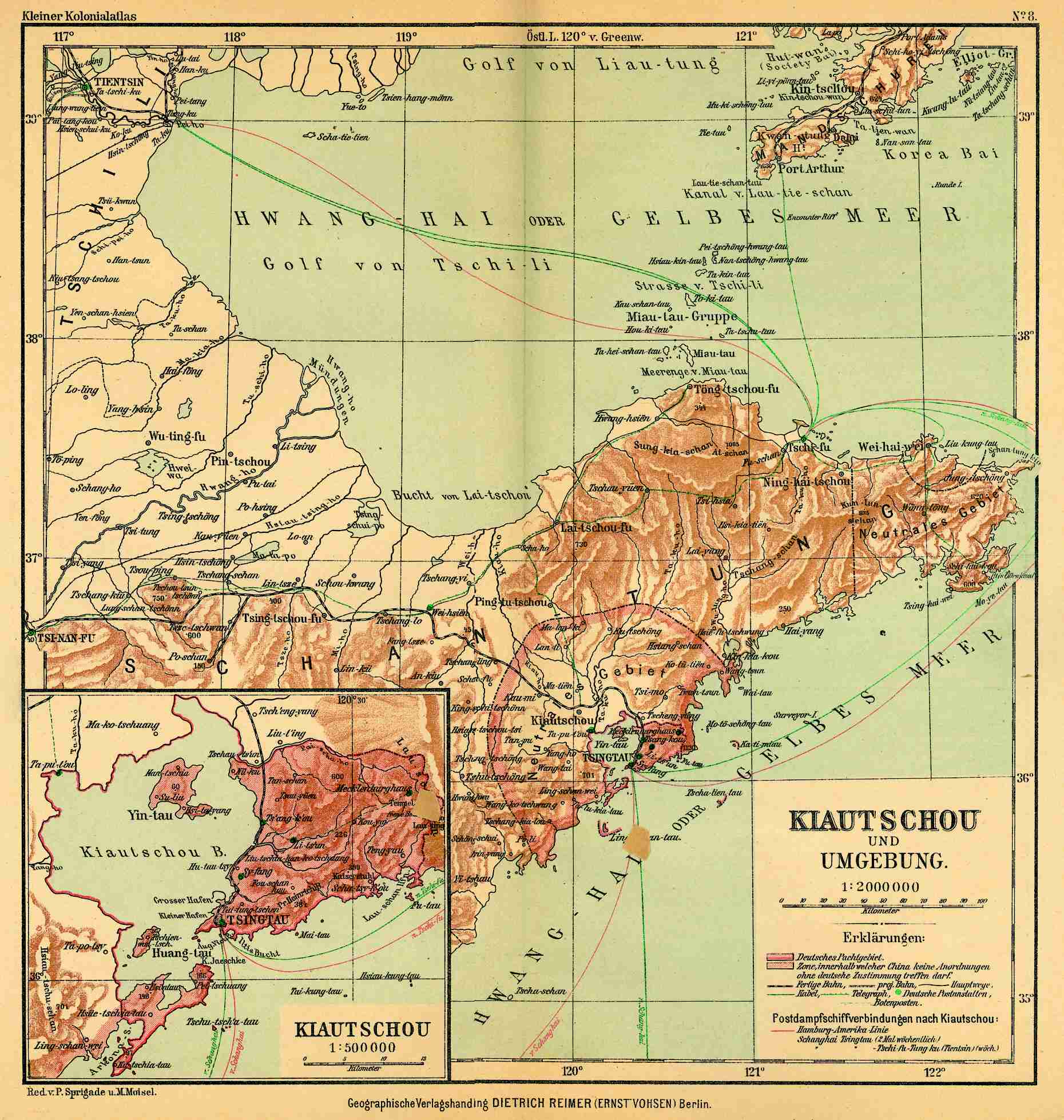 Karte 1: »Kiautschou und Umgebung« aus »Kleiner Kolonialatlas«, herausgegeben von Sprigade und Moisel, Ausgabe 1912, Berlin: Reimer. (Bitte anklicken, um das Originalformat zu sehen.)