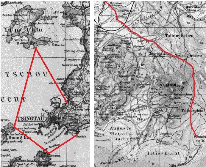Karten 3 und 4: Garnisongrenze see- und landseitig, erstellt auf der Grundlage einer Karte aus Meyers Geographischem Handatlas (1912).